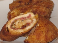 לשטח פרוסת חזה עוף, להניח מעל פרוסת בשר מעושן וכפית של צנוברים קלויים. לסגור את העוף משני צדדיו ולקפל. לטבול בבלילת ביצה מתובלת משני צדדים ולצפות בפירורי לחם .